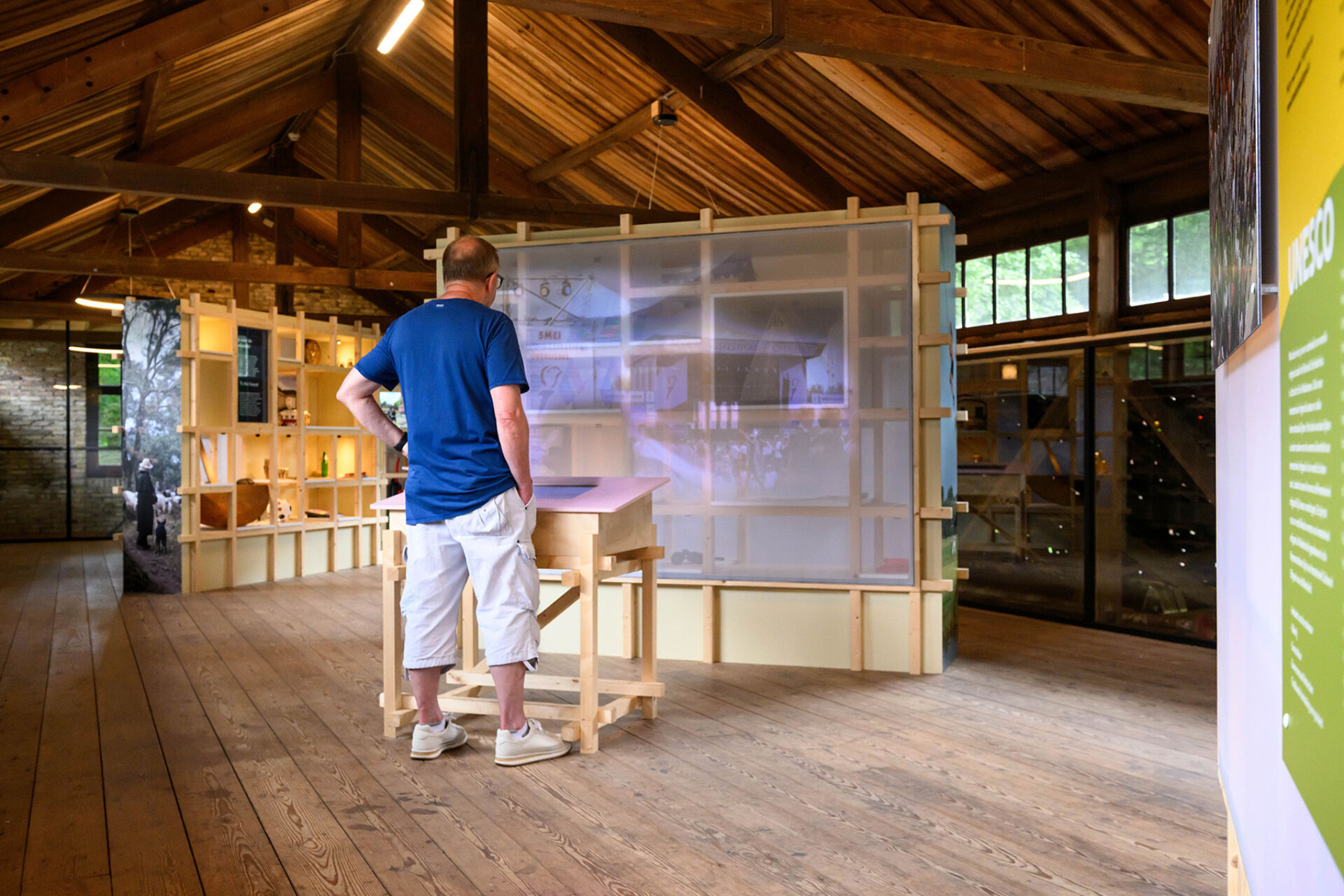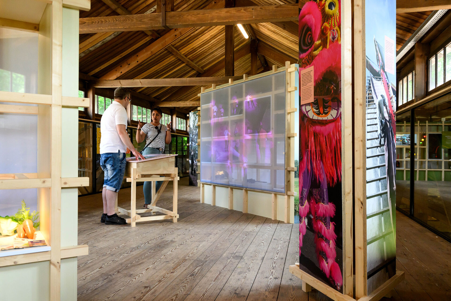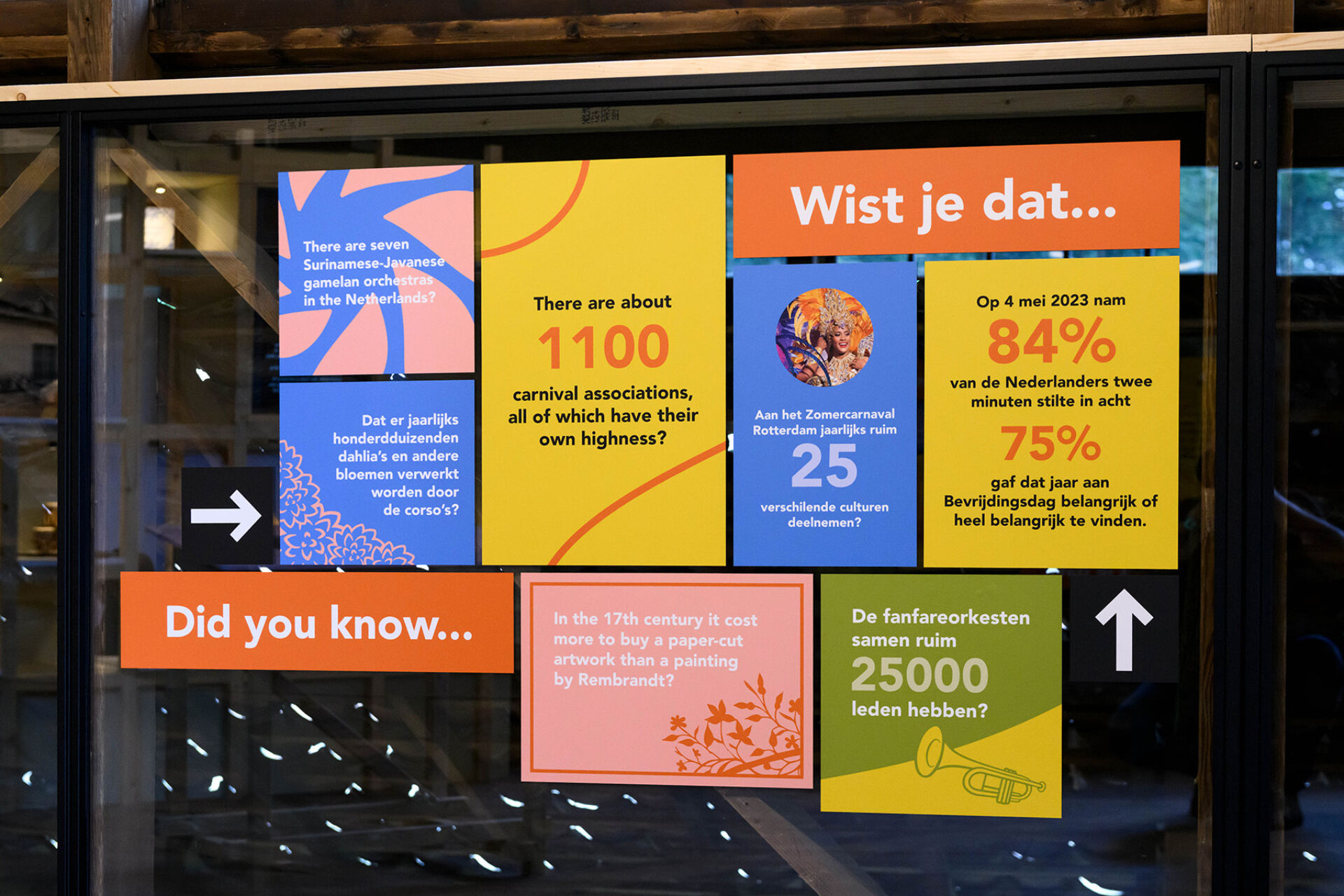 Wist-je-datjes met kleurrijke illustraties op de glazen zijwanden van de houtloods maken de vele vormen van levend immaterieel erfgoed zichtbaar.