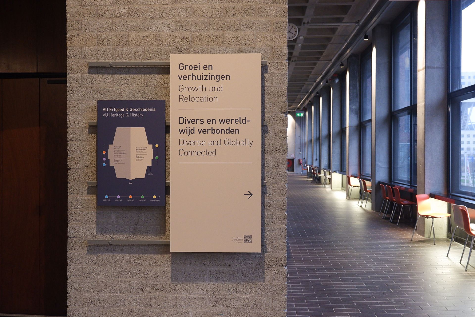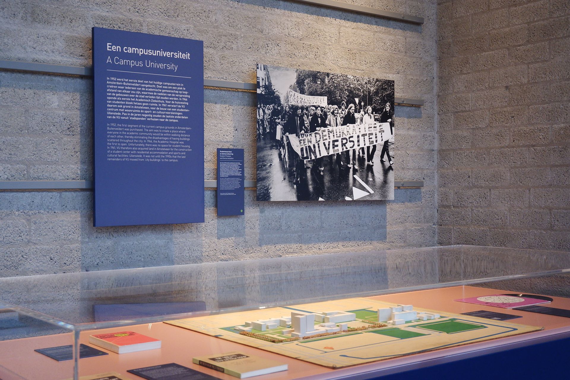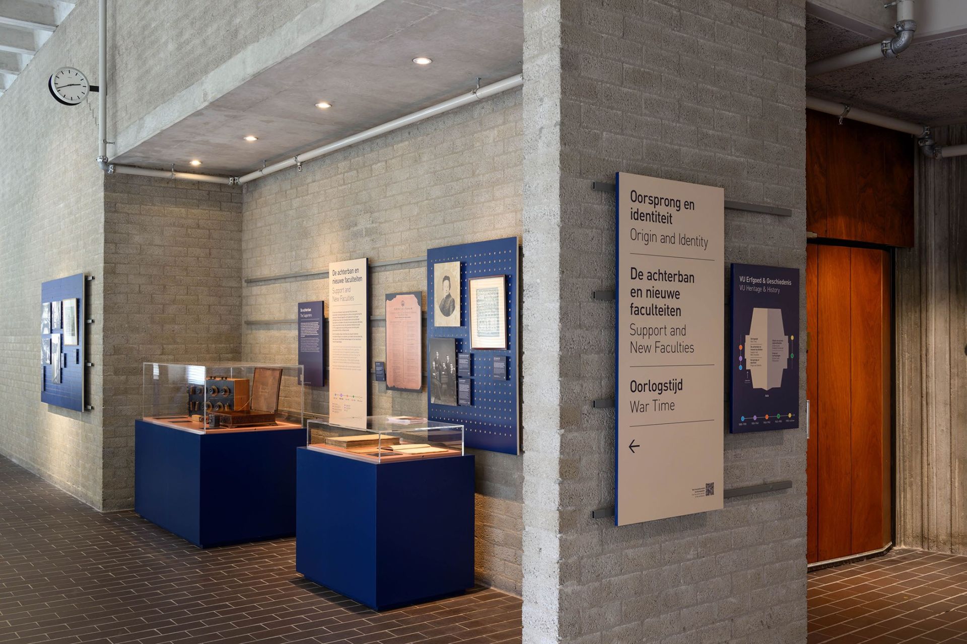 Voor de presentatie hebben we een modulair systeem ontworpen dat de VU in staat stelt om doorlopend op de presentatie te reflecteren en deze aan te passen op basis van nieuwe inzichten, verhalen en collectiestukken. Dit systeem complementeert de brutalistische architectuur, en voegt tegelijkertijd een eigentijdse vormentaal toe. Zo ontstaat een tijdloze setting waarin ook nieuwe VU-verhalen hun plek kunnen vinden.