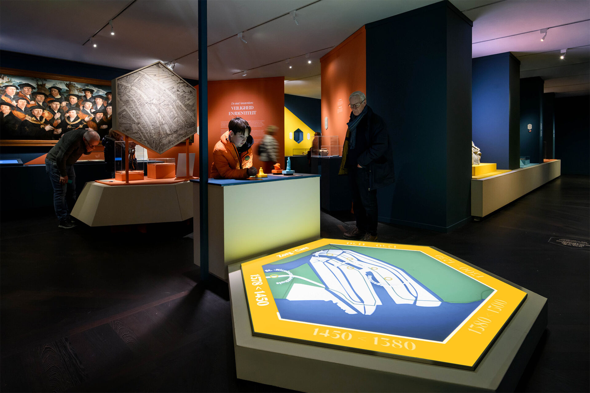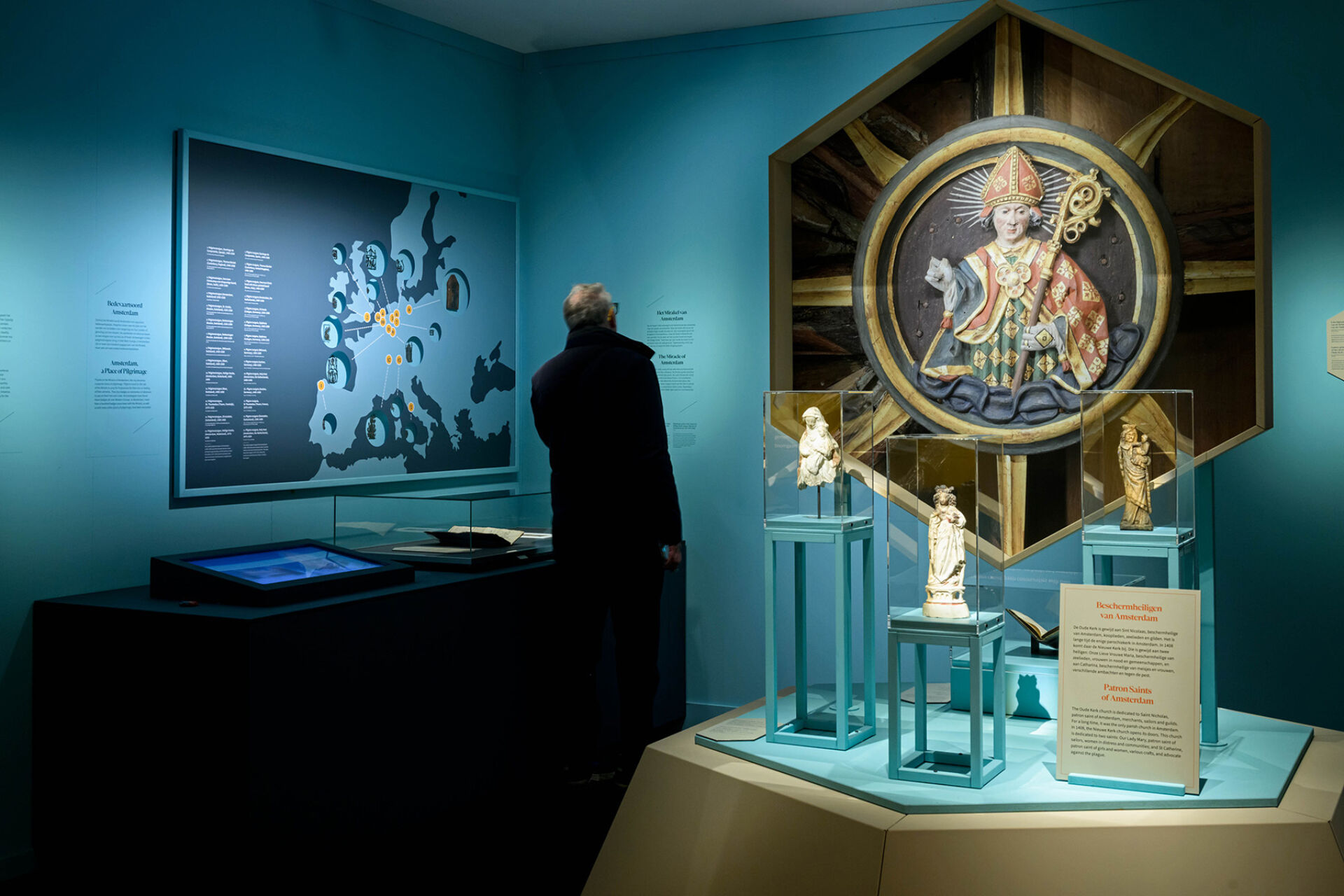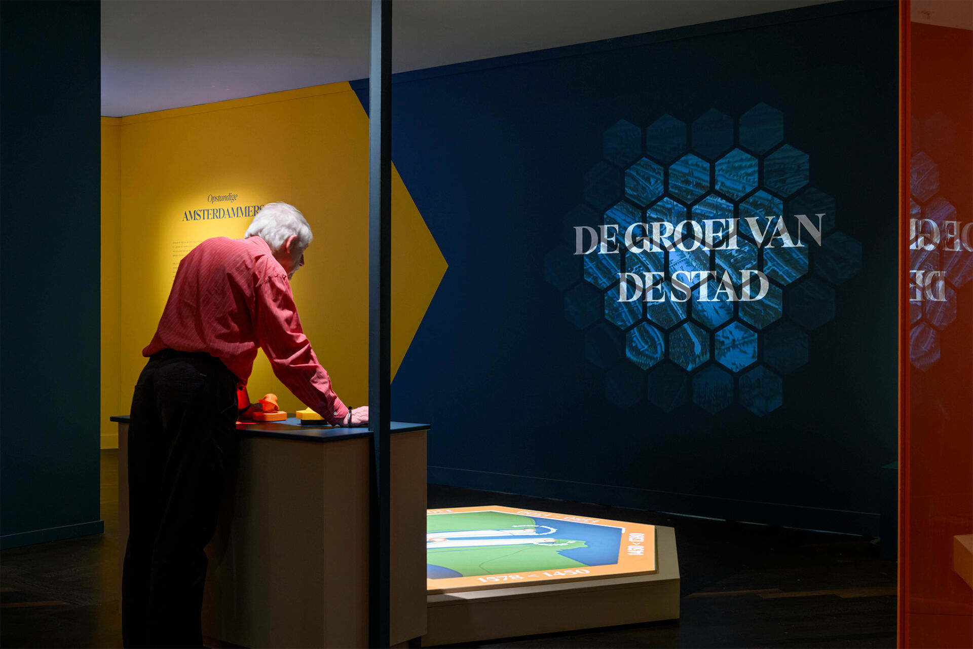Place a token and discover how Amsterdam evolved during the Middle Ages. A floor projection shows where your chosen theme — care, religion, or safety — played a role in the city.